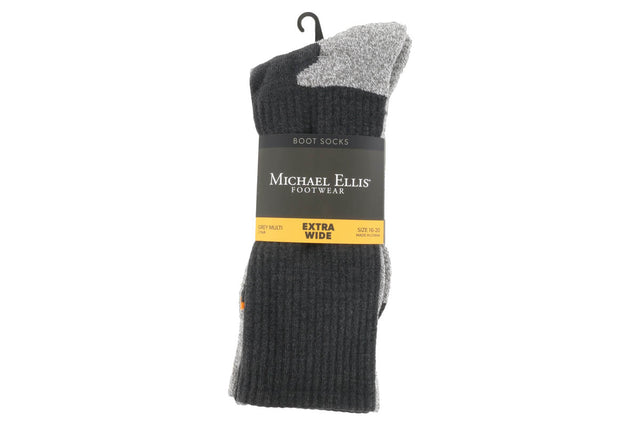 This 2 pack of grey work boot and hiking socks from Michael Ellis are designed specifically for big feet. This pack contains one pair charcoal grey and one pair heathered medium grey crew height boot socks. Fitting sizes 16 through 20, the extra wide width pack should fit widths 5E to 9E. Two pair of socks per package.